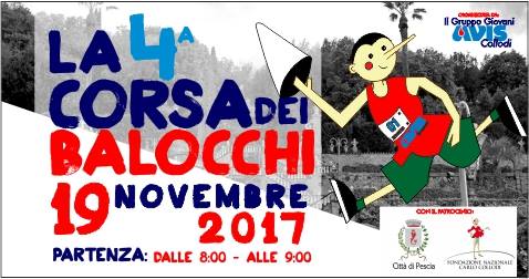 Il Gruppo Giovani dell’Avis di Collodi organizza per domenica 19 novembre la 4^ Corsa dei Balocchi. La partenza è prevista in Piazza San Bartolomeo a Collodi presso la Misericordia a partire dalle ore 8,00 e sino alle ore 9,00. La corsa è aperta a tutti e sono previsti percorsi della lunghezza di 3, 6, 12 e 18 km, con transito all’interno del Giardino Garzoni e Parco di Pinocchio. Ristori lungo il percorso.
