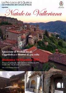 Come ogni anno la Pro Loco di San Quirico organizza “Natale in Valleriana”. Nella splendida cornice del paese medioevale ci sarà l’esposizione di prodotti locali, artigianali, oggettistica e mestieri di una volta, oltre a degustazione di necci, bomboloni, vino e vin brulè. Dalle 14,30 fino al tramonto.