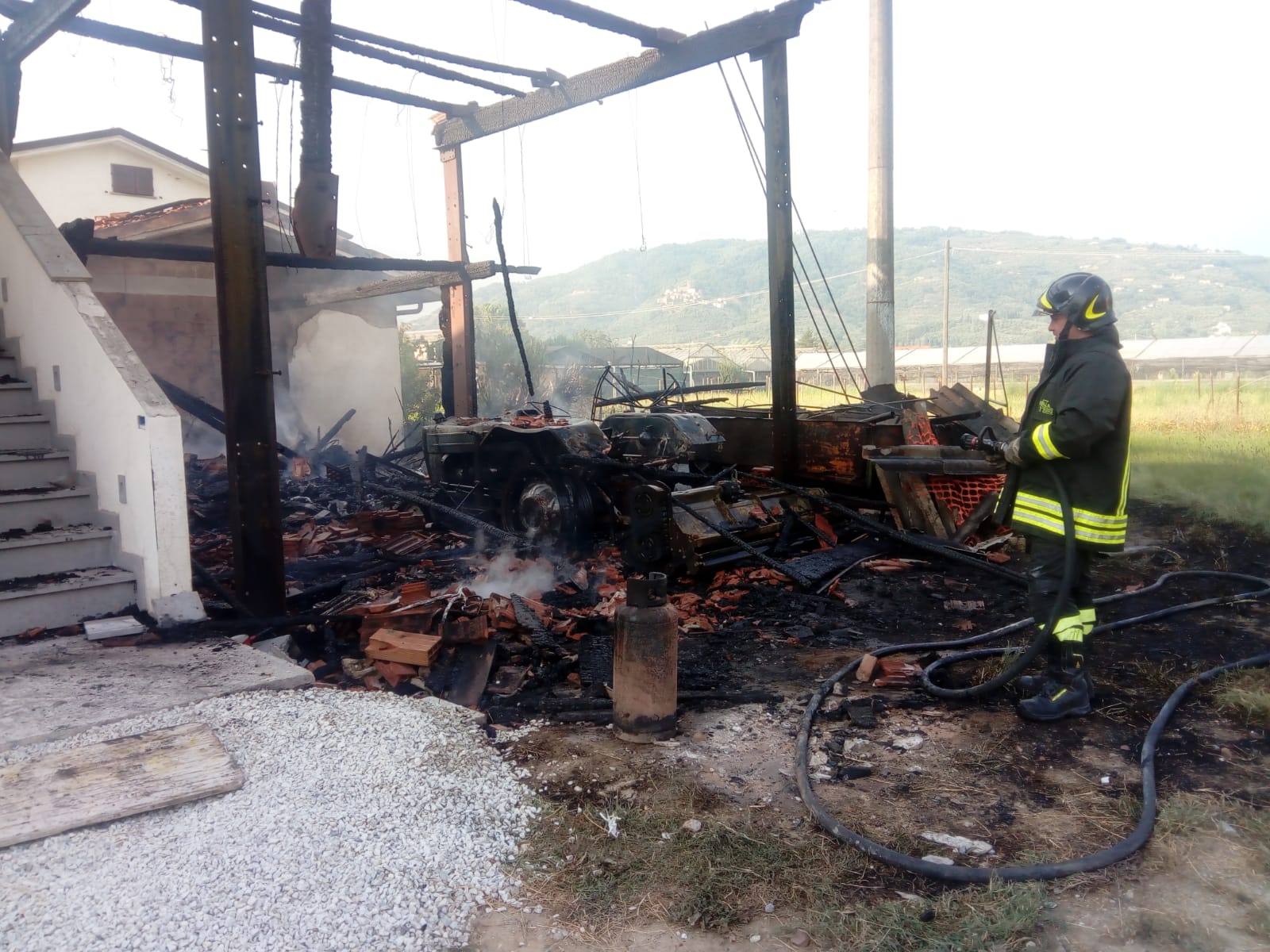 Sono andati a fuoco un trattore, un carrello e altri attrezzi agricoli. È crollato il tetto. Nell’abitazione non vi era alcuna persona.
