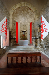 La chiesetta conserva l’originario romanico, un’unica navata suddivisa in due campate. L’interno è spoglio, è stato restaurato nei primi anni 2000 dal Rione Santa Maria. Nella piccola abside, si possono decifrare i resti di un affresco della fine del XV sec raffigurante san Bernardino da Siena.