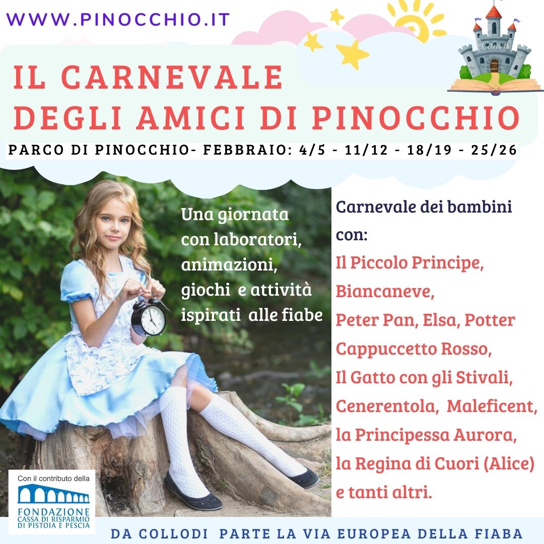 Il Carnevale degli Amici di Pinocchio è la manifestazione a misura di bambino che nei fine settimana di febbraio farà incontrare ai piccoli visitatori del Parco di Pinocchio e ai loro familiari, molti dei personaggi delle favole più famose come il Piccolo Principe, Cenerentola, Cappuccetto Rosso, Peter Pan, il Gatto con gli Stivali… Ispirata dalla Via Europea della Fiaba, l’ iniziativa, , rivolta ai bambini dai 2 ai 14 anni, è della Fondazione Nazionale Carlo Collodi con il contributo della Fondazione Cassa di Risparmio di Pistoia e Pescia.