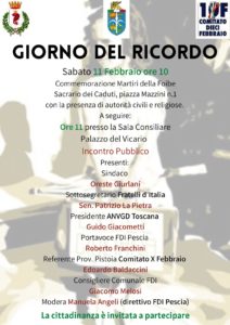 Sabato 11 febbraio a partire dalle ore 10, in piazza Mazzini al Sacrario dei Caduti e nella sala consiliare si terrà un incontro per ricordare i Martiri delle Foibe, col patrocinio del Comune di Pescia.