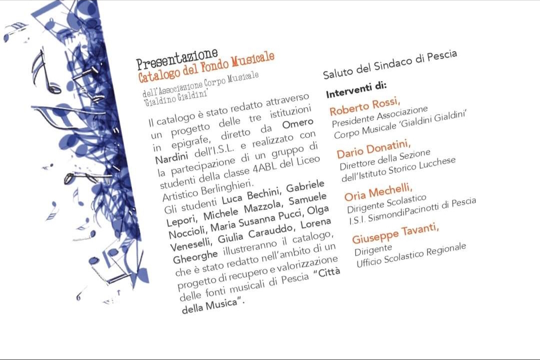 L’Associazione Corpo Musicale ‘Gialdino Gialdini’ di Pescia, con l’Istituto Storico Lucchese- sez. Montecarlo-Pescia/Valdinievole, e l’ISI Sismondi-Pacinotti di Pescia, presenteranno venerdì 9 alle 17 il Catalogo del Fondo Musicale dell’Associazione Corpo Musicale ‘Gialdino Gialdini’. Il catalogo, redatto dalle tre istituzioni sopracitate, è stato diretto da Omero Nardini.