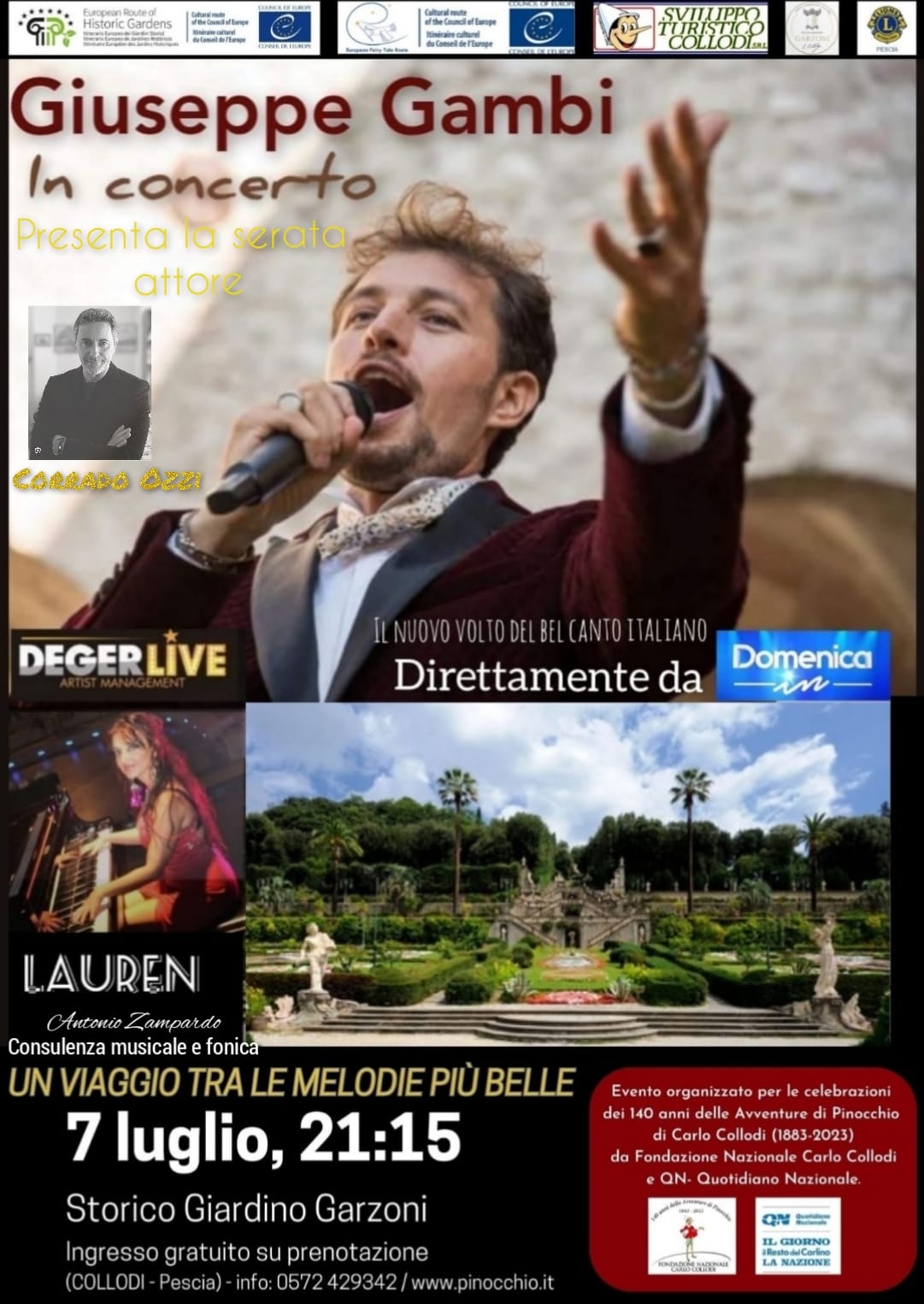Il clou della serata è il concerto del tenore pop Giuseppe Gambi, nuovo talento della musica lirica italiana e già ospite d’onore di diversi programmi RAI e Mediaset, che affascinerà il pubblico con il concerto dal titolo “Un viaggio nelle melodie più belle”. Si spazierà da celebri arie liriche (Nessun dorma, E lucean le stelle, La donna è mobile) a classici della canzone napoletana antica (Reginella, O’ sole mio), fino alla canzone contemporanea (Con te partirò, My Way, I migliori anni). Omaggio a Morricone eseguito dalla pianista Loren e violino.