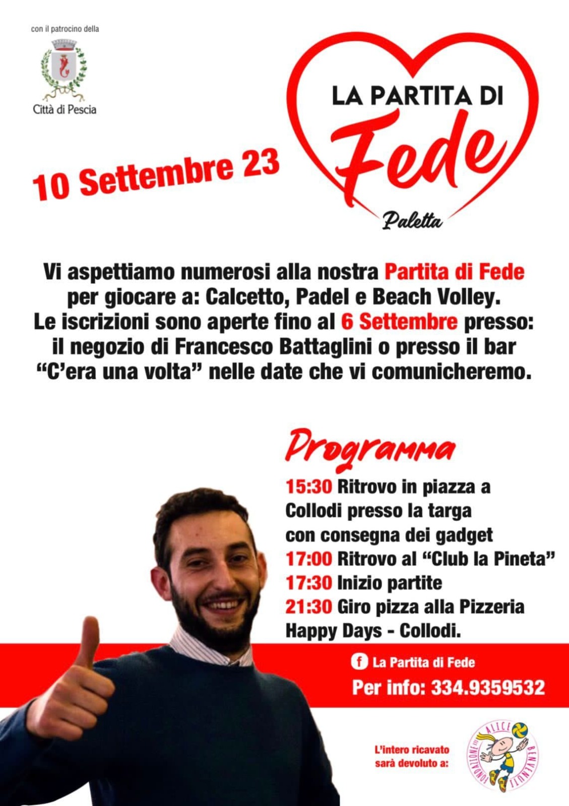 Domenica 10 settembre si terrà un partita calcetto, padel e beach volley presso il “Club la Pineta” in ricordo di Federico Biagi, Paletta per gli amici, deceduto nel marzo 2021 per le ferite riportate in seguito allincidente contro un’abitazione a Collodi, in sella ad un motorino.