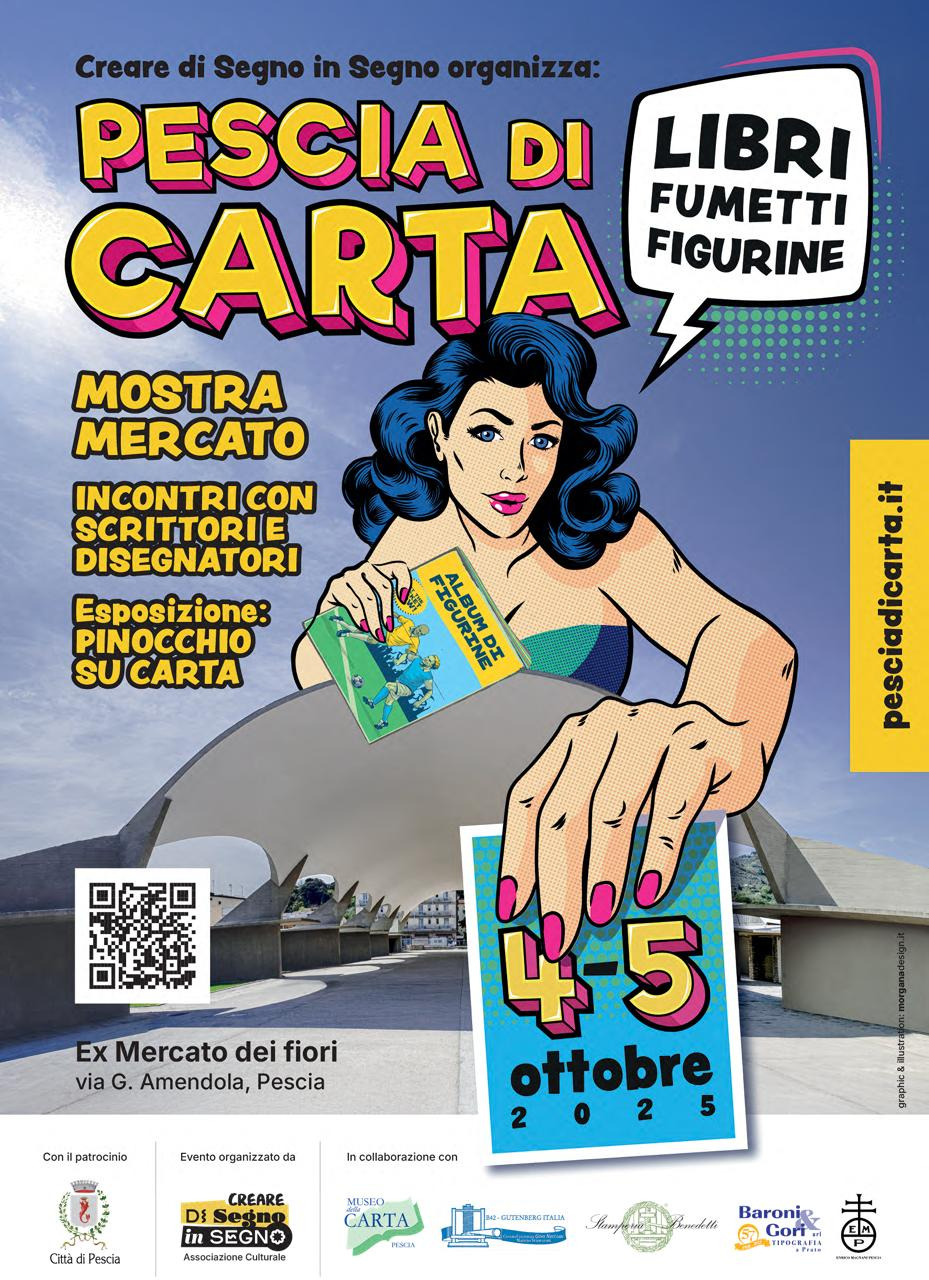 Sabato 4 e domenica 5 ottobre l’associazione culturale Creare di segno in segno ha organizzato, all’ex Mercato dei Fiori, Pescia di Carta, mostra mercato di fumetti, libri e figurine, in collaborazione con molte realtà del territorio, come il Museo della Carta di Pietrabuona, la Stamperia Benedetti con l’associazione B42 Gutemberg Italia, il liceo Berlinghieri, l’associazione Gocce di Vita, il circolo Arci Agorà, il patrocinio dell’amministrazione comunale, e il sostegno di Banca di Pescia e Cascina e Tipografia Baroni e Gori di Prato.
