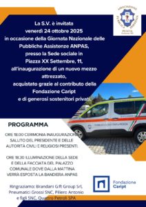 Venerdì 24 ottobre 2025 in occasione della giornata nazionale delle pubbliche assistenze ANPAS presso la sede sociale in piazza XX settembre 11, la Pubblica Assistenza di Pescia inaugura un nuovo mezzo attrezzato, acquistato grazie al contributo della Fondazione Caripit e di generosi sostenitori privati.