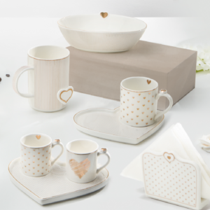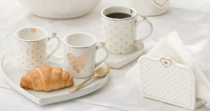 Mug, tazzine, alzatine, vassoi e ciotole coordinati, tra cuori e righe, accompagnano con stile i gesti di ogni giorno: versare il caffè, condividere una parola gentile, iniziare insieme una nuova giornata.