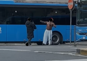 L’uomo non ha mostrato segni di aggressività, ma, stando alla testimonianza di chi ha assistito alla scena, ha iniziato a cantare a voce spiegata. A rendere la situazione ancora più singolare, la presenza di un presunto connazionale che lo seguiva riprendendo l’intera scena con il cellulare.
