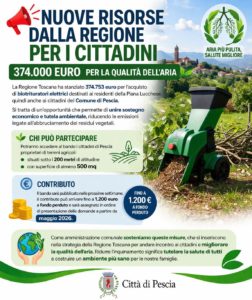 La Regione Toscana ha stanziato oltre 374mila euro per la qualità dell’aria per l’acquisto di biotrituratori elettrici destinati ai residenti della piana lucchese quindi anche ai cittadini del comune di Pescia.